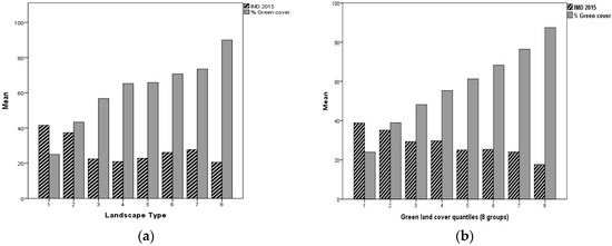 A comparison of the distribution of index of multiple deprivation scores (IMD) and Shannon’s diversity index (SHDI) according to both the eight landscape types and eight quantile groups for green and blue cover is presented in Figure 12a–d.