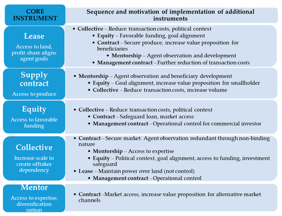 Following from the theoretical framework, Figure 2 summarizes the combinations of instruments as observed in our 14 case studies. Each of the IBs is centered on the instrument best suited to gain access to a specific resource (in italic in Table 1), thus overcoming an initial dependency. Additional instruments are then added to the IB structure to reduce transaction costs, to safeguard IB-specific investments, and to ensure that the smallholders/low-income communities adhere to the contract that they agreed upon. These motivations create unique organizational structures, interlinking up to five different instruments, for the integration of IB beneficiaries into commercial value chains.