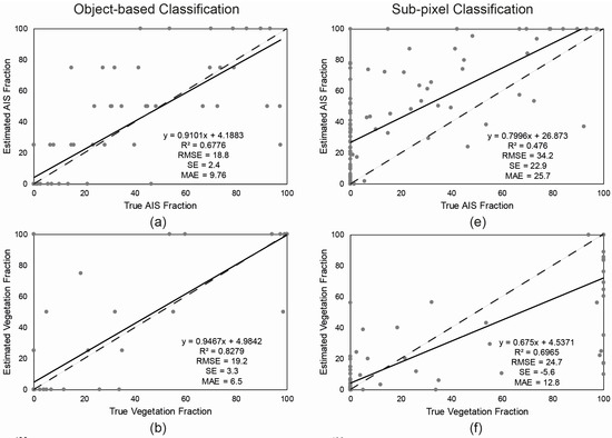 Scatterplots were drawn to examine the relationship between the independent reference data (true data) and the estimated data modeled by linear SMA and object-based classification for each land cover type (Figure 9). The results of a detailed accuracy assessment are reported in each scatterplot where RMSE, MAE, SE and R2 were calculated to quantify the performance of both methodologies. Accuracy measurements indicate that object-based classification using spectral indices provides an adequate estimation of impervious surface distribution with values of RMSE = 18.8%, SE = 2.4%, and MAE = 9.76% (Figure 9a–d). These values are considerably lower when compared to the sub-pixel accuracy measurements (RMSE = 34.2%; SE = 22.9%; MAE = 25.7%), which suggests a better general estimation achieved with the object-based classification. However, the correlation between estimated and true impervious surface fraction is significantly higher (R2 = 67.7%) in the object-based classification than in the sub-pixel classification (R2 = 47.6%).