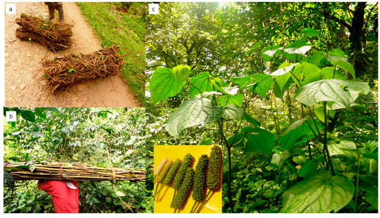 Figure 2. (a) Lianas; (b) young, strong and straight wood for live fences; and (c) Piper capense spice that the farmers collect from forest and forest coffee ecosystems in the Gera district of Ethiopia.
