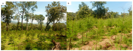 Figure 3. (a) Coffee plantation; and (b) newly established Cupressus lusitanica plantation in Trackon’s coffee investment land in October 2013, Gera district, Ethiopia.