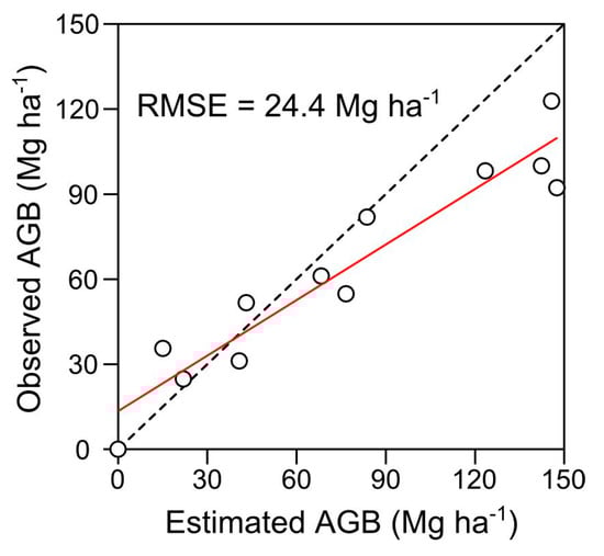 Relationships between estimated vs. observed AGB of 12 validation plots. The red line indicates the regression line. The dashed line indicates a 1:1 line.