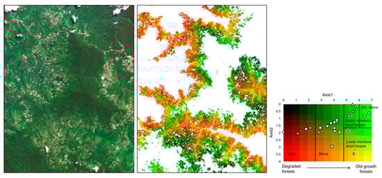 WorldView-2 image in 2010 (RGB/Band3, Band2, Band1) (left), and the derived plant-community composition map of the entire area (right). The white color indicates the areas above 1400 m and below 900 m asl, which are excluded from the analysis, because models have been derived exclusively from the field data between 900 and 1400 m asl. Each pixel in the map indicates both DCA axis 1 and DCA axis 2 scores as a red/green spectral composite. The green-color spectrum was used for the DCA axis 1 scores (successional stages) and the red-color spectrum was used for the DCA axis 2 scores (altitude zones). The spectral matrix beside the map shows a gradation of the change of the composition. The matrix was divided into five vegetation types according to the category of Fujiki et al. []. Fujiki et al. [] categorized the same 25 stands into vegetation types using TWINSPAN.