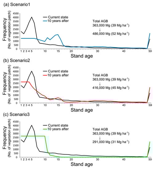 Histograms comparing the current state (2010) of vegetation with simulated future vegetation (2020) based on the three scenarios. The figures indicate frequency of vegetation patches per stand age. The black line indicates the current state of vegetation as of 2010. The blue line is the vegetation pattern estimated based on scenario 1 (a); the red line indicates the vegetation pattern estimated based on scenario 2 (b); and the green line indicates the vegetation pattern estimated based on scenario 3 (c). See text for the detailed explanation of each scenario.