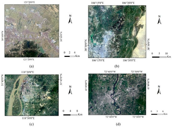 Landsat 5 images used in case studies: (a) a part of Cixi city, Zhejiang, China; (b) a part of Yinchuan city, Ningxia, China; (c) a part of Maanshan city, Anhui, China; (d) a part of Hartford, CT, USA.
