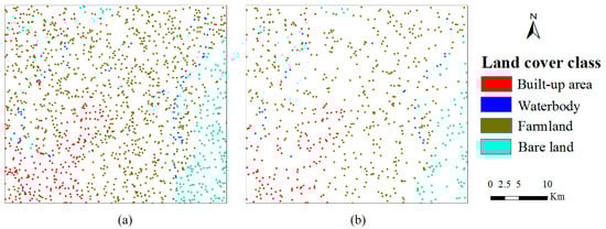 Expert-interpreted land use/cover sample data for the study area in Yinchuan: (a) a subset of 1428 sample data for MCRF co-simulation (0.087% of the total image pixels); and (b) a subset of 518 sample data for validation.