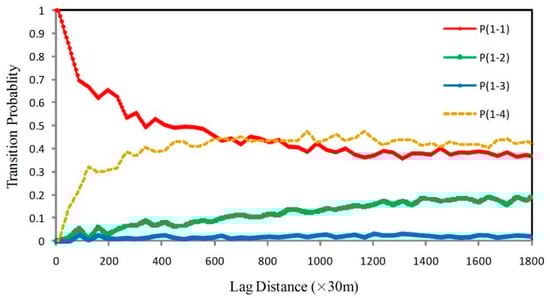 where represents the transition probability from class i to class j, Z(u) stands for a spatially stationary random variable at a specific location u and h, as a vector variable, refers to the separate distance between the two spatial points u and u + h. Visually, the transiogram is a transition probability-lag curve. While an auto-transiogram represents the autocorrelation of a land use/cover class, a cross-transiogram (i ≠ j) represents the cross-correlation of a pair of land use/cover classes. As transition probability, cross-transiograms are asymmetric and can be unidirectional.