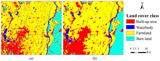 Land use/cover classification results for the Yinchuan study area: (a) pre-classification map; (b) MCRF post-classification.