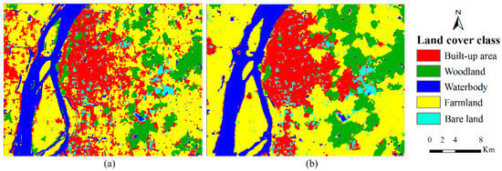 Land use/cover classification results for the Cixi study area: (a) pre-classification map; (b) MCRF post-classification map.