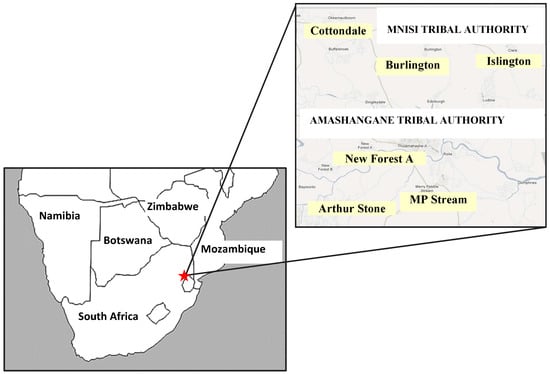 This study was conducted in six villages spanning two chieftaincies that fall under the Bushbuckridge local municipality in Mpumalanga Province (31°0′–31°35′ E; 24°30′–25°0′ S), South Africa (see Figure 1). In the Amashangane chieftaincy, the three villages were New Forest A, Merry Pebble Stream (MP Stream) and Arthur Stone and in the Mnisi chieftaincy, the study villages were Cottondale, Burlington and Islington. In order to examine similarities and differences in the firewood regulation systems of different villages, the study villages were purposively selected as they share similar patterns in biophysical and socio-economic conditions, i.e., any differences noted in the regulation systems were unlikely to result from biophysical and socio-economic characteristics.