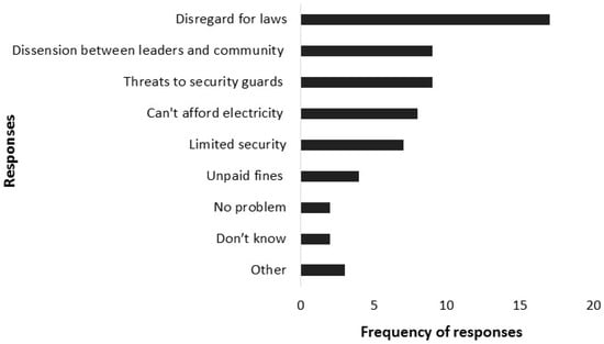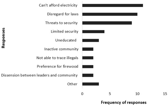 One of the most important challenges to effective firewood regulation, as noted most frequently by focus groups and second most frequently by leaders, was community members’ noncompliance with well-established firewood laws (Figure 2 and Figure 3). Such disregard for the local rules was encapsulated in statements such as ‘they [the community] do know the laws but they keep breaking them’, ‘lots of people break the law’ and ‘everyone harvests, nobody cares’. This concern was raised almost twice the number of times as the second most cited response (Figure 2). Although some focus groups viewed such disobedience as insubordination where it is just ‘human nature to break the rules’, a far more common perception was that villagers could not afford to buy permits and were therefore forced ‘to harvest [illegally] to survive’. These constraints of poverty and unemployment were also emphasized in suggestions of households relying on firewood as a coping strategy because they are unable to pay for electricity or alternative energy sources. This issue, as stated in one focus group, of ‘[e]veryone harvests. Electricity is expensive’ was the most frequently cited challenge by leaders (Figure 3).