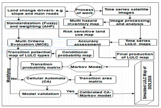 Remote sensing (RS) and geographic information system (GIS) technologies are globally applied key tools for the accurate characterization of LULC change [,,,,,] and monitoring and mapping multiple hazard areas [,,,,,,,]. RS and GIS-based risk-area mapping is recognized as an imperative process to obtain effective hazard risk reduction and mitigation output []. Monitoring over-time changes requires consistency among maps, both ontologically and statistically [], and time-series remote sensing data has made it possible to monitor changes in urban structure [] and LULC [,]. Application, GIS, and remote sensing along with LULC modeling provides an wider understanding of human and environmental systems and improved knowledge of future changes cities are to confront [,]. Land change-related research works are cooperative for land managers and policy makers to predict potential future landscape changes; simulation modeling tends to function as the experimental tool that helps governments to characterize hazard-exposure consequences and their incorporation into hazard mitigation plans [,]. LULC models are capable of simplifying the complexity of LULC, analyzing past changes and simulating future changes effectively [,]. Urban growth modeling and simulation history dates back to the 1950s []. It is gradually gaining a wide range of attention [,,]. A cellular-automata Markov (CA-Markov) model is appropriate to simulate the LULC change in multiple time scales [,] and determine the actual amount of change in land use classes [,,,]. Furthermore, few studies has integrated LULC scenarios with hazards exposure and population []. Consequently, exploring multiple hazard risks is a fundamental prerequisite to establishing sustainable disaster risk management plans.