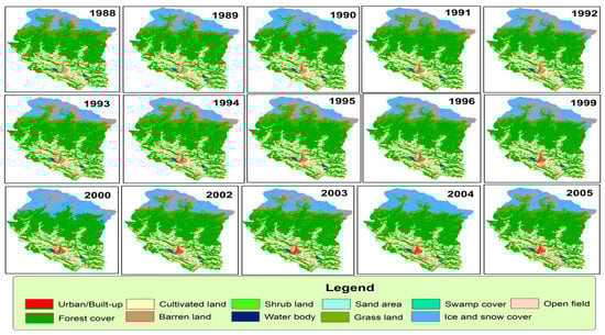 Exploring the spatiotemporal pattern of LULC dynamics is a strong foundation for sustainable urban planning and effective land management [,]. The explored research outputs indicate a wide range of fluctuations over the study years in various land-cover classes. Overall changes include (a) a gradual increase in urban/built-up (UB), forest cover (FC) and open field (OF) land areas; (b) a linear decrease in cultivated (CL) and shrub land (SL); (c) high fluctuation in barren land (BL) grass land (GL) and ice and snow-cover (I & SC) land areas; and (d) almost constant sizes of sandy area (SA), water body (WB) and swamp cover (SC).