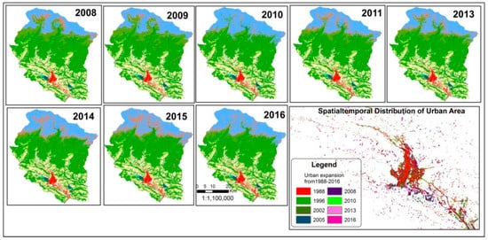 (a) LULC map for individual years from 1988 to 2016; (b) urban area from 1988 to 2016.