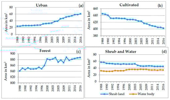 Urban/built-up areas, which totaled 24.06 km2 in 1988, increased to 60.74 km2 in 2016 (Figure 4a). Contrarily, cultivated land gradually declined from 445.02 km2 in 1988 to 402.55 km2 in 2016 (Figure 4b). Despite fluctuation during different years, forest cover has gained an overall increase in the 28 years of the investigation period. Forest had occupied 841.22 km2 in 1988, and this expanded to 887.25 km2 by 2016 (Figure 4c). Expansion of forest cover is closely associated with privately owned as well as community based forest management programs []. The reason behind this is the overall preservation of forest resources because of community forest management programs, and the expansion of private forests in the abandoned cultivated land. The remaining land-cover classes (shrub and water) remained almost constant over the study periods (Figure 4d).