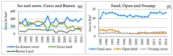 LULC trend during 1988–2016 for land-use types (a) urban/built-up; (b) cultivated; (c) forest; (d) shrub and water; (e) ice and snow-cover, grass land and barren land (f) sand, open and swamp-cover.