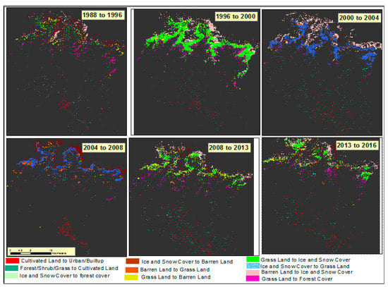 For instance, ice/snow had occupied 277.04 km2 in 1988, while 317.36 km2 areas was grassland. As ice/snow-covered area increased to 443.65 km2 in 2010, grassland area dropped down to 152.53 km2 (Supplementary Information S3). Consequently, during 2004, barren land was confined within 32.8 km2 and 411.93 km2 was ice/snow-covered. However, barren land increased to 80.04 km2 in 2005 mainly because of the significant decrease of ice/snow-cover to 287.97 km2. LULC transition maps during 1988–1996, 1996–2000, 2000–2004, 2004–2008, 2008–2013, and 2013–2016 have been presented in Figure 5. Transition map shows that cultivated land area changed into urban/built-up as stated above. The northern part of the study area witnessed remarkable transitions between grass land and ice/snow cover. For example, during 1996–2000, ice and snow cover had occupied large part of grassland. However, during 2000–2004, remarkable areas of grass land were transformed into ice and snow cover. A similar trend was observed in the conversion of barren land and ice and snow cover area.