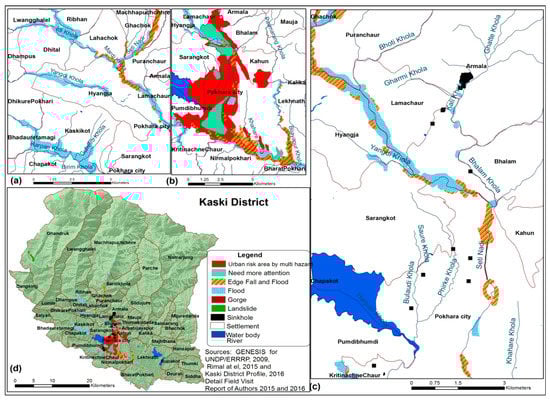The Himalayan region often experiences severe fatalities generated from various hazards []. High precipitation in the mountain range and adjacent foothills generally results in extreme flooding in the area and the forelands []. The hazard of flooding becomes stronger with the excessive rainfall and alteration of floodplains into impervious surfaces [,] and the modification of hydrological cycle due to land-use changes [], which take place mostly in unregulated municipal systems [] and urban poor areas []. Landslide is one of the crucial geomorphic drivers of LULC change; it redistributes the sediments from mountains and hills to the gentler plains. Exploitation of forest cover, over steeping natural slopes, disruption in the hydrological system, high precipitation, massive earthquakes, and rampant land-use practices enhance the landslide susceptibility of any region []. The threat is nourished by (1) rapid urbanization, haphazard land-use practice, and the accommodation of high populations in hazard prone areas and (2) a combination of structural poverty, decaying and sub-standard infrastructures, the concentration of economic assets and commercial/industrial activities, and a weak institutional capacity for the disaster risk management []. Kaski is the district which received the highest precipitation in a year in the country. The district has been exposed to multiple hazards including avalanches, debris flow, glacial lake outburst floods (GLOFs), landslides, edge fall, floods, sinkholes, land subsidence, and fires common in the district. Geologically, the region is incorporated in the Pokhara formation which is related to the catastrophic debris and water flow from the upper glaciated cirque of the Sabche Pokhara basin. The urban centers, particularly downstream, are more susceptible to the adverse effects of hazards,
