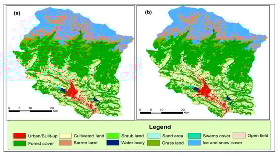 Simulated LULC maps for (a) 2025 and (b) 2035.