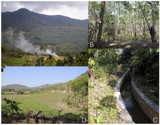 The landscape of Manggarai Barat. (A) Forested hillsides showing the boundary between the candlenut (Aleurites moluccana) agroforest and primary forest on steeper slopes. In the foreground are rice fields and a small fire burning crop residue; (B) A kemiri agroforest and mixed cropping gardens—home gardens—surround the rice fields; (C) an irrigation canal which the brings water from a small dam in the mountains to the rice fields in the valley; (D) irrigated rice fields and mixed production forest and homegardens (right).