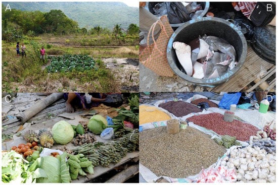 The villages in the landscape are accessible by roads that are in poor condition. Despite the poor condition of the road there is a constant flow of food into the landscape. The Saturday morning market sells a diverse range of products: marine fish, pulses (brown and yellow lentils, mung beans), red and brown beans, and varieties of ready-made noodles (Figure 3C).