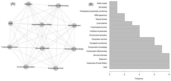 Seven nodes represented 50% of the total betweenness of nodes, ranked as follows: (1) NRM agreement, (2) Burung Indonesia, (3) Behaviour, (4) Conservation (Biodiversity), (5) Water supply, (6) Environment education, and (7) Ecosystem services (Table 1). We identified eight maximal cliques within the network. An example of one of the maximal cliques is shown in Figure 4A. This clique contains ten nodes all of which are found in the ‘importance’ set except Adat (local laws, customs, and traditions), Forest-based tourism and Conservation knowledge. A subset of 17 nodes populated the eight cliques (Figure 4B). The nodes called NRM agreement, Environment education, Conservation (Biodiversity), and Burung Indonesia were included in all maximal cliques.