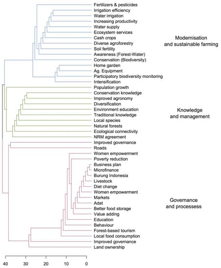 The Mbeliling food security and biodiversity conservation nexus network represented as a dendrogram. The dendrogram shows the node names at the tips of the branches of the ‘tree’. The relationships between nodes are represented by the distances between them. The nodes are classified into clusters based on the fastgreedy algorithm, and shown as different coloured branches. (1) Modernisation and sustainable farming; (2) Knowledge and management; and (3) Governance and processes.