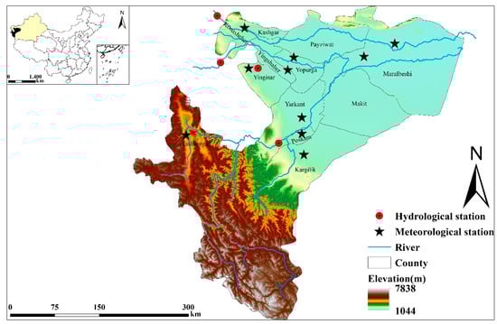 Water resources in the Kashgar Region depend mainly on snow melt from the mountain glacier, snow, and ice, which are major supply sources of surface runoff, ground water storage, and drinking water for the large population in this area. In the Kashgar Region, therefore, water is a major limiting resource, not only as a precious natural resource, but also as an important social factor for economic development []. Besides human activities, climate changes have also affected the hydrological cycle in the Kashgar Region. Global warming accelerates the process of atmospheric circulation and the hydrological cycle, subsequently affecting spatial and temporal distribution of water resources and exacerbating water shortages, especially in arid regions []. The occurrence of surface water in the Kashgar Region is strongly related to climatic, hydrological, and geomorphological factors.
