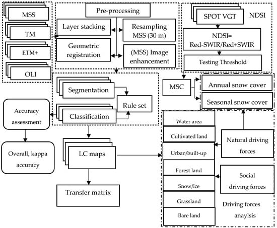 Based on the study area’s morphology and landscape, the possible appearance of LC types was considered to be 21 classes, and a hierarchical classification system of 21 classes was grouped into seven aggregated classes of LC: urban/built-up area, water area, grassland, cultivated land, forestland, snow/ice (considered only in summertime), and bare land. Table 2 provides detailed descriptions of each class. These classes’ information was extracted using the maximum likelihood classification method combined with image segmentation (Figure 2). During summer seasons with cloud-free conditions, 48 Landsat images were acquired to map snow/ice and major LC types in the study area. Geometric correction was conducted by collecting for each image 40 well-conditioned ground control points, determined from topographic maps using ArcGIS. Root mean square (RMS) errors were less than 0.5 pixels for MSS (60 m), TM, ETM+, and OLI (30 m) images. MSS images were resampled to a 30 m cell size using the nearest-neighbor method. All images were geometrically corrected, with a reference system of a UTM map projection Zone 44 North on a WGS 1984 datum. In the initial step, we segmented band-stacked images into groups of pixels as objects. Homogenous pixel groups were created, which are called image objects, based on size, shape, and area. The multi-segmentation method utilized object-based classification because it generates objects very closely resembling ground features []. We implemented image segmentation using eCognition 9.0 to create objects that delineated LC classes. We applied two levels for the segmentation and classification process based on LC classes. Level 1 was applied for small and spread LC classes, such as grassland. The scale parameter was set at 5 []. Level 2 was applied for large LC classes, such as cultivated land, water, and bare land. The scale parameter was set at 10. Color and shape parameters were adjusted to 0.9 and 0.1, respectively []. After segmentation was completed, LC information was extracted with the maximum likelihood classification method []. Training sites were collected from original Landsat data based on segmentation results, their different spectral features, Google Earth high-resolution images, and topographic maps, respectively. Because of the study area’s high mountains’ cloudy conditions during wintertime, collecting cloud-free Landsat images was difficult. Therefore, SPOT VGT imagery, chosen for mapping snow/ice cover due to its high temporal resolution and its maximum value composite (MVC) approach, helped minimized the effect of cloud cover []. The next section provides a detailed description of the snow/ice cover mapping process.
