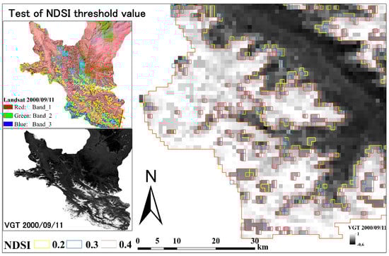 where Red and SWIR are band 2 and band 4 of digital numbers of SPOT VGT, respectively []. To determine whether a pixel is covered by snow or not, an observed pixel must meet a certain NDSI threshold value. A threshold value of 0.4 has been used to distinguish snow from bright soils, rocks, and clouds []. Kondoh and Suzuki [] in 2005 modified the 0.4 of NDSI threshold using an NDVI adjustment to take into account forest effects on snow detection in Northern Eurasia. In this study, the original threshold value of 0.4 underestimated snow-covered areas. Therefore, several threshold values of 0.4, 0.3, and 0.2 were tested for NDSI, and the best agreement was found with a slightly lower threshold value of 0.2 (Figure 3). The best agreement for snow and ice pixels extraction using VGT data should correspond to broad snow-cover characteristics of the local area. Thus, a lower threshold value of 0.2 was adopted for VGT snow and ice detection in this study area. Then, 567 stages for the entire duration of time-series VGT data were collected to investigate snow cover changes from 1 January 1999 to 30 May 2014. From first year of September to the next year of August, 36 images were composited, representing the annual maximum snow cover area. Then, we averaged the annual areas to determine the annual average extent of snow cover in square kilometers. Seasonal snow cover variation was calculated quarterly: spring (March, April, May), summer (June, July, August), fall (September, October, November), and winter (December, January, November).