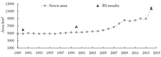 Sown area and remotely sensed (RS) estimated cultivated area comparison for Kashgar Region (sown area source []).