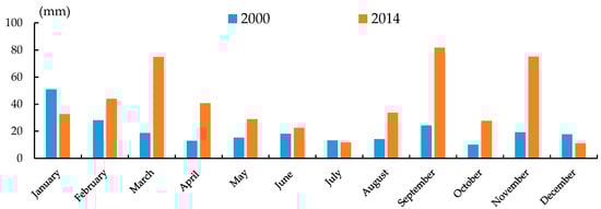 Monthly precipitation variation of mountain region in 2000 and 2014.