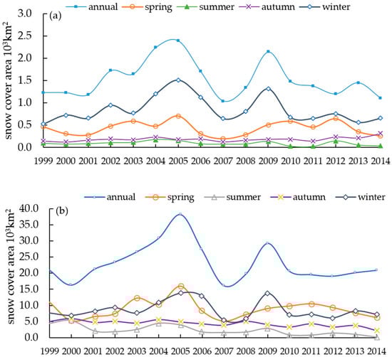 Annual and seasonal snow cover variation of Kashgar River (a) and Yarkant River (b).