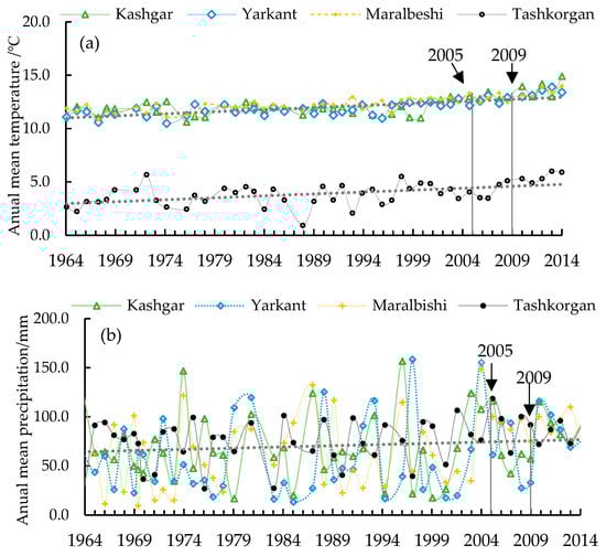 Annual mean temperature (a); and precipitation (b) trend of Kashgar Region.