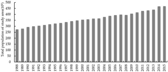 Population growth has been identified as a major driving force for agricultural expansion and water consumption by Zhou et al. (2003) [], Zhang et al. (2003) [], Wang et al. (2008) [], and Til et al. (2015) [] for different areas in arid Northwest China. The population of the Kashgar Region rose from 2,745,362 in 1988 to 4,683,114 in 2014 [], an increase of approximately 70%. Generally, the growing population has requested more land for basic needs of living, such as food and housing. More than 78% of households in rural areas depend largely on land resources, and agriculture contributes a large share of the gross domestic product (GDP). Crop and cotton production has increased, and the total agricultural area has expanded. Figure 10 shows the population increase in the Kashgar Region. A high positive correlation was found between population and sown area. The majority of grassland and forestland was occupied by cultivated land to satisfy people’s demand for food (Table 6). As a result, grassland decreased from 4779.1 km2 in 1972 to 2680.6 km2 in 2000, and forest decreased from 3584.5 km2 in 1972 to 1344.5 km2 in 2014. Bare land and cultivated land were converted to urban/built-up land, which increased from 40.2 km2 in 1972 to 392.8 km2 in 2014. Population growth resulted in the expansion of cultivated land, with reclamation and evident shrinkage of grass and forest cover. Therefore, population is a major factor in LUCCs.