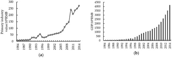 Primary industry (a); and gross domestic product (GDP) (b) of study area (source: []).