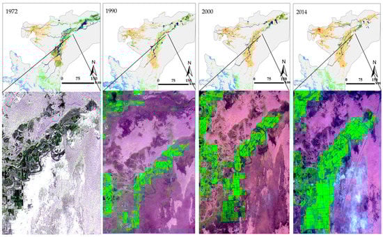 Conversely, from 1972 to 2014, forestland decreased from 3584.5 km2 (3.1%) to 1344.5 km2 (1.2%). Agricultural expansion was a key factor for forestland’s reduction. Forest area has mainly been distributed around the study area’s riverbanks, and it depends on groundwater resources, that is, groundwater seeping from a river. Therefore, forestland was easily converted into cultivated land due to abundant water resources for agricultural activity.
