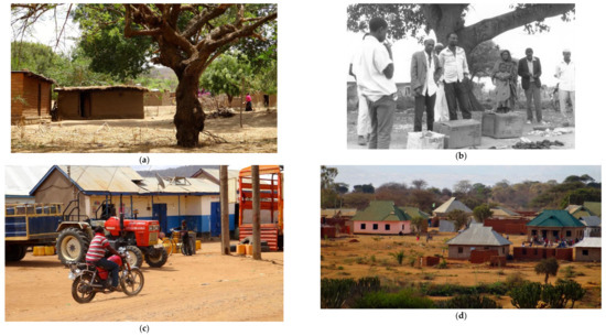 Today a fleet of motorcycles are parked here, waiting to transport people and goods to various destinations in the area. Motorbikes appeared in Goima in numbers by 2005–6, and a new village centre, with modern buildings, has moved a few hundred metres further east, on land that used to be the primary school’s sports field, but that was opened up for commercial development. Here, one also finds a new spacious mosque, and a new secondary school is not far away (Figure 2c,d).