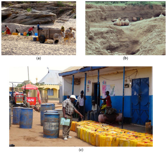 (a) Drawing water from shallow wells in dry river bed. (b) Gourds lined up to be filled with water from shallow wells dug in a dry river bed, 1991. (c) Household water on sale at Goima village centre, 2016.