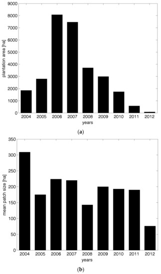 This trend is visible in Figure 2, and is quantified further in Figure 3. Measuring the distribution of individual plantation areas by year, we observe that the total clearing for rubber peaked in 2006 and 2007, with over 8000 and 7000 ha (respectively) converted in those two years alone (Figure 2a and Figure 3a). As Figure 2 and Figure 3b show (the first visually, the second through the measurement of mean patch size), new rubber areas tended to be especially large in these early years of 2004–2007. By 2009, as local resistance and government concern increased, and in the wake of a 2007 nationwide moratorium on rubber triggered by the VLRG project in particular [15], the rate of new conversions to rubber in the area began to slow. An NGO was also working in Bachieng District to provide legal training related to land issues, and had also supported other awareness raising activities about rubber expansion, the environment, livelihoods and land. This had some impact on the situation, and made it more difficult for the concessioners to gain large pieces of land. Even as the average patch size remained relatively large (only in 2008 did sizes drop below 150 ha, and then not again until 2012), total new clearances dropped significantly: to 3000 ha in 2009, and then by roughly half each year subsequently (Figure 3a). In 2012, the final year of our analysis, we identified only a single new plantation, and this was less than 80 ha in size.