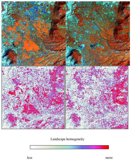 Landsat satellite views of rubber plantations in one sample location (top) and corresponding changes in landscape homogeneity (defined as decreases in contrast) quantified by image texture (bottom) in southern Laos. The image in the top the left was acquired in 2002 before the major expansion in rubber plantations took place. The image on the top right was acquired in 2011 following the major expansion. Landscape homogeneity is defined as lack of contrast between pixel values in a local image window or neighborhood.