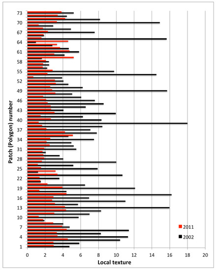 Quantitative changes in image texture by patch between 2002 and 2011 associated with rubber expansion. Here we use image local contrast as a form of image texture defined as the difference between pixel values in a local image window. In this context, the values in the X-axis correspond the variability of pixel values in each rubber plantation patch. The values in the Y-axis correspond to unique patch ID associated with a rubber plantation.