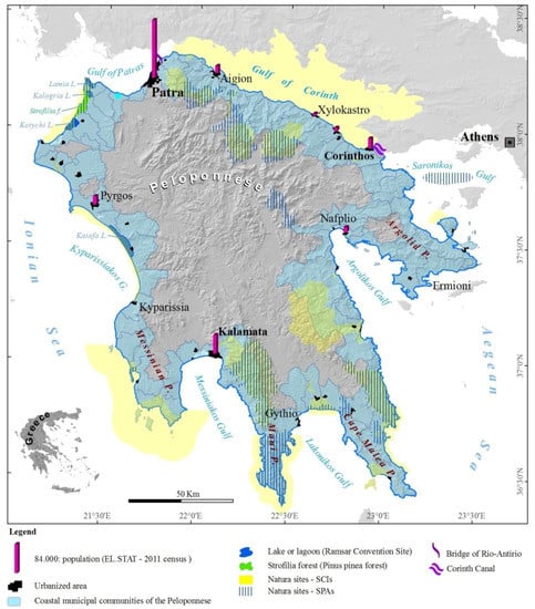 The Peloponnese consists of 152 municipal communities (a municipal community is the lowest level of government within the organizational structure of Greece), 73 of which are coastal (Figure 1). It has a population of 1,047,000, which corresponds to less than 10 % of the total population of Greece. Most of its population is concentrated in the coastal zone. The average population density in the coastal municipal communities is 77.8 inhabitants/km2, whereas the mean value for Greece is 82.29 inhabitants/km2. Its GDP contributes less than 7% of total GDP in Greece. Unemployment rates are higher than the national rates and three times higher than the average unemployment rate in the EU-28. The economy of the study area is distributed between the primary sector (mostly agricultural activities) and tourism related servicesand a small yet gradually growing industrial activityover the last years. Despite the dominance of the mountainous terrain, the Peloponnese hosts some of the most fertile lands in the country, producing renowned wine labels and top quality olive oil. Tourism is the region’s heavy industry with high quality services and infrastructure facilities mainly along the coastline. Nowadays, the infrastructure works in transportation create new challenges for the area. The national road that connects Athens with Patras (the capital of the Peloponnese and the third largest city in Greece), extends along the north shoreline of the Peloponnese, while numerous cities and settlements, such as Patras, Kalamata, Korinthos, Nafplio, etc., are coastal (Figure 1).