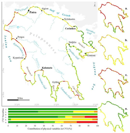 Maps of classification of the Peloponnese coastline into five physical vulnerability classes according to the variables of the Coastal Vulnerability Index (CVI) values. Inset maps (a–c,e) indicate the vulnerability ranking of various segments of the coast based on the CVI variables ((a) geomorphology, (b) shoreline change rate, (c) coastal slope and (e) mean significant wave height). Since the variables of relative sea-level rise and tidal range are considered to have the same value along the entire coastline of the Peloponnese, the figure does not include vulnerability ranking maps for these variables. The bar diagram shows the length (in percentage %) of shoreline in each vulnerability category for the CVI variables.