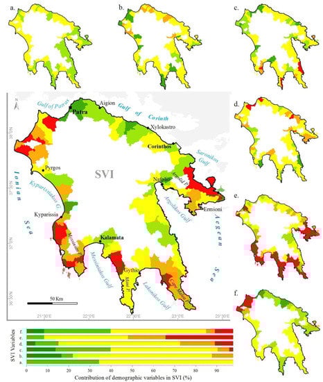 Maps of classification of the coastal municipal communities of the Peloponnese into five social vulnerability classes according to the variables of the Social Vulnerability Index (SVI) values. Inset maps (a–f) indicate the social vulnerability ranking of the communities based on the categorization of the SVI variables’ values ((a) population density, (b) share of women in total population, (c) share of persons above 65 in total population, (d) share of children below 5 in total population, (e) share of foreign-born in total population and (f) share of low educated in total population). Inset bar diagram show the length (in percentage %) of shoreline in each vulnerability category for the SVI variables.