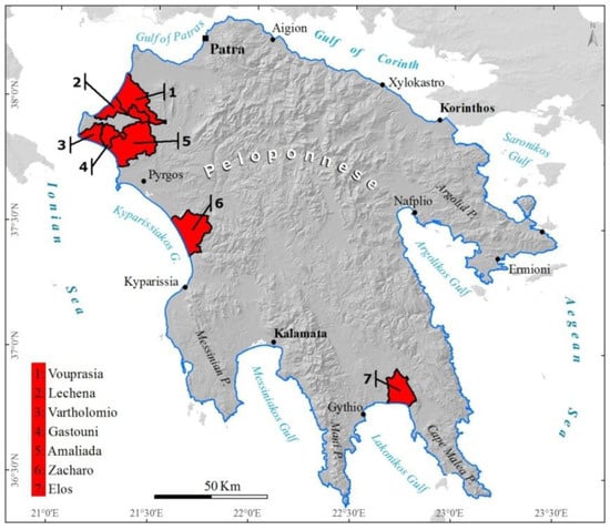 The Peloponnese is also of great environmental significance since it hosts ecologically important areas. Along its northwestern coast there is a 28 km zone with sandy beaches, dunes, lagoons (Kalogria, Strofilia, Lamia, and Kotychi, which is a Ramsar Convention site and the most significant lagoon in the Peloponnese), marshy areas, salt and freshwater wetlands, and the most extensive Pinuspinea forest in Greece (Strofilia forest) (Figure 1). Along the shore of the Kyparissiakos Gulf exists the significant wetland of Kaiafa Lake and a unique sand dune ecosystem of great ecological value.