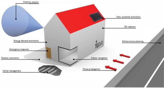 - Biljecki, F.; Stoter, J.; Ledoux, H.; Zlatanova, S.; Çöltekin, A. Applications of 3D City Models: State of the Art Review. ISPRS Int. J. Geo-Inf. 2015, 4, 2842–2889. [Google Scholar] [CrossRef]