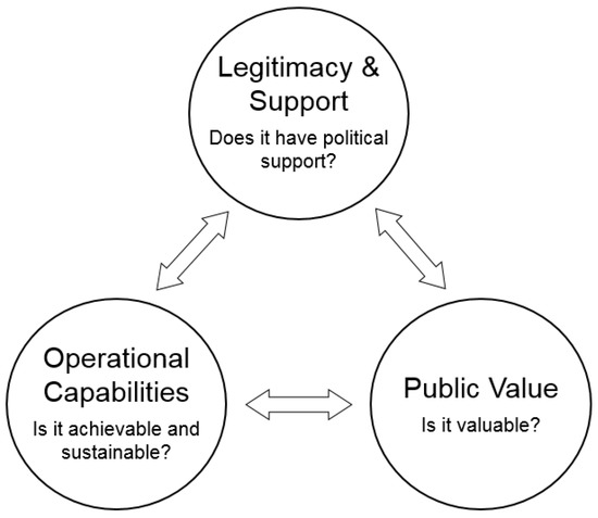 Moore’s initial proposition of public value is diagrammatized as a ‘strategic triangle’ of the following three related components (and ensuing trade-offs) (see Figure 2) [28]: legitimacy and support, operational capabilities, and public value. This serves to focus the attention of public organizations on the following three key questions: (1) is what we are delivering valuable?, (2) will the provision of the product or service be supported both by political masters and the community?, and (3) is the provision of the product or service achievable and sustainable? This helps to clarify the ‘public value’ an organization intends to produce, how this could be legitimized and supported, and what it would take to deliver this. Rhodes and Wanna [31] criticized the ‘strategic triangle’ for the uncertainty of its intended application, however, Alford and O’Flynn [26] argued that the triangle was useful in multiple ways including helping to clarify thinking about the objectives of public organizations (i.e., public value creation).