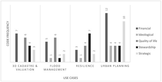 The deductive analysis demonstrates how stakeholders in the EuroSDR workshops perceive how 3D geo-information could lead to various types of public value being realized. To compare the strength of stakeholder consensus around the types of public value creation across use cases, we have used the code frequency as an indicative quantifying instrument. The distribution of strength of consensus is shown in Figure 4.
