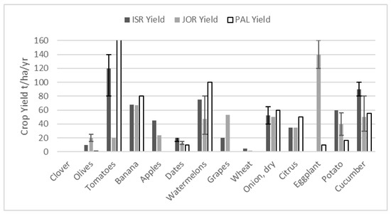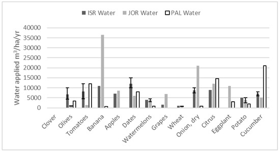 | Crop | 2010 Yield (tonnes) | Area (dunam) | Water/Dunam (derived) | Total Water (m3) | Water/Crop (m3/t) (derived) |